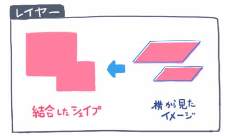 この結合方法で作ったシェイプは、実際には、『2つの以上のパスが、同一レイヤー内で重なっている状態』で、見た目上はくっ付いてるといった感じです。“重ねて結合”というイメージです。