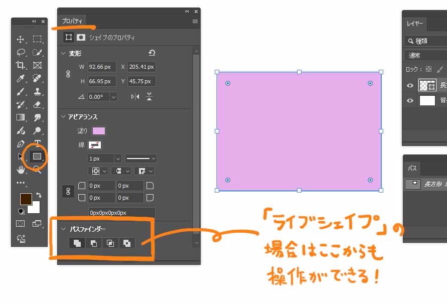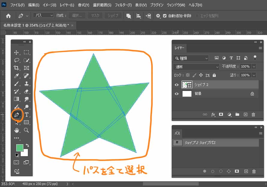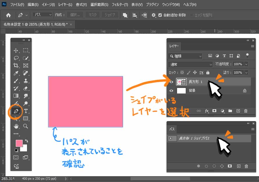 まず、ペンツールを選択した状態で、任意のシェイプがいるレイヤーを選択します。このとき、カンバス上のシェイプにパスが表示されていることを確認します。