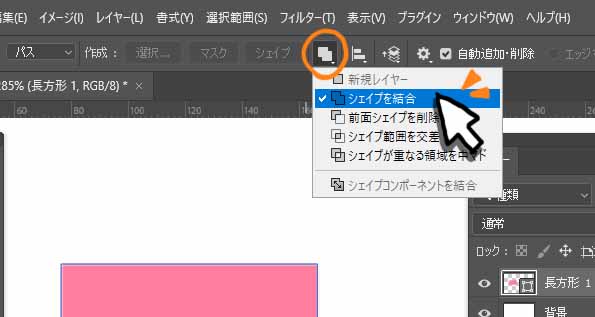 つぎに、Photoshop 上部のオプションバーの右側の四角いアイコンをクリックします。すると、いくつかの項目が展開されるので「シェイプを結合」を選択します。(このとき、オプションバーの左側、シェイプ or パスの選択はどちらでもOKです。)