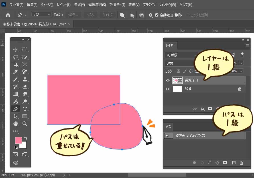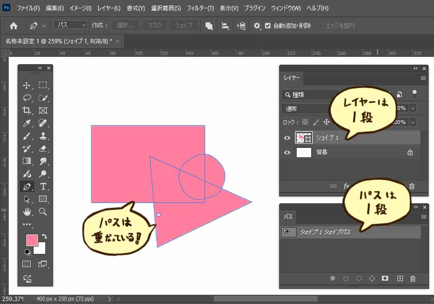 ペンツールを選択した状態で、結合して1つになったレイヤーを選択してみると、カンバス上のシェイプに複数のパスが表示されていることが確認できますね。