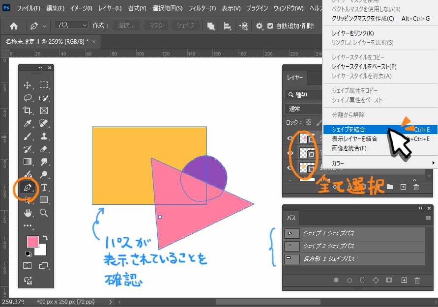 結合したい任意のシェイプがいるレイヤーを全て選択して右クリック、「シェイプを結合」をクリックします。