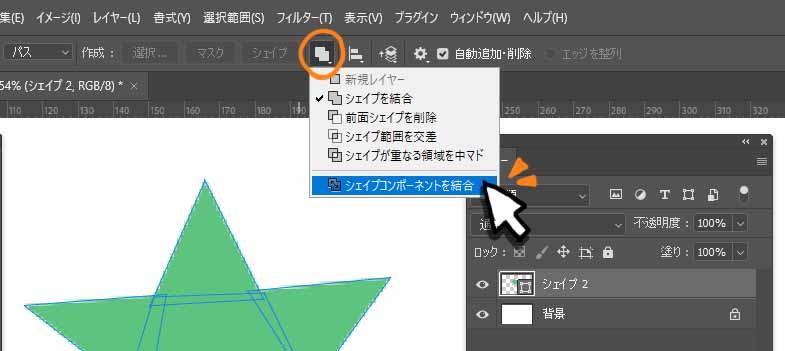 そして、Photoshop 上部のオプションバーの右側の四角いアイコンから展開される「シェイプコンポーネントを結合」をクリックします。(このとき、オプションバーの左側、シェイプ or パスの選択はどちらでもOKです。)